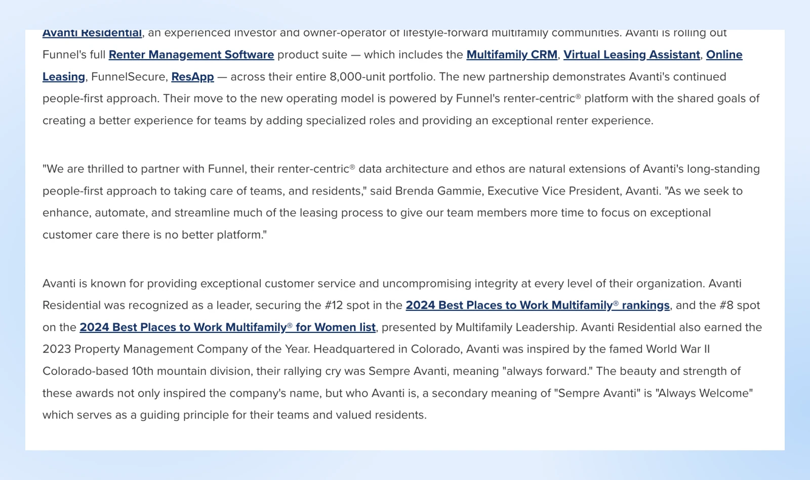 让我们继续以阿凡提和 Funnel 为例。导语之后的段落引用了 Funnel 的一段话。然后,这篇文章介绍了 Avanti 是一家什么样的公司,该公司获得过哪些奖项等。