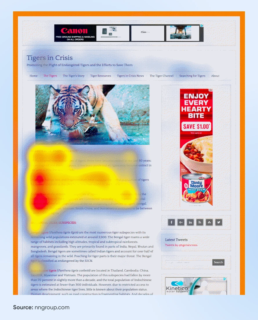 根据 NN-group 的一项眼动跟踪研究,人们在网上的阅读模式呈 F 型。这项研究使用热图来直观显示用户在网页上的注意力集中点。在这些热图中,红色区域表示页面中浏览最多的部分,而冷色则表示浏览较少的区域。