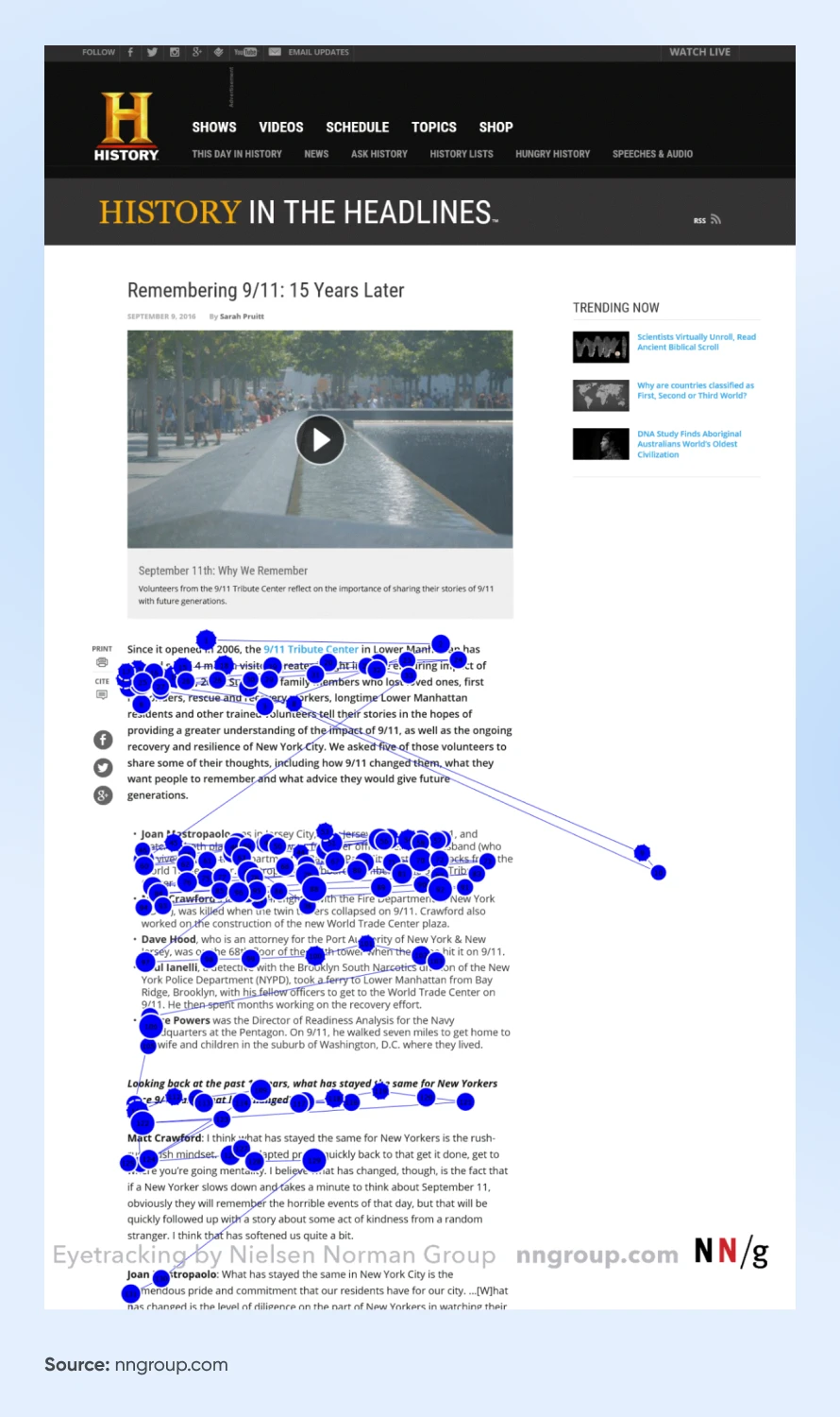 NN-Group 还指出,如果每个段落的前几个字足够有趣,能够吸引读者的注意力,那么 F 模式就会重复出现,就像下面这张眼动图一样: