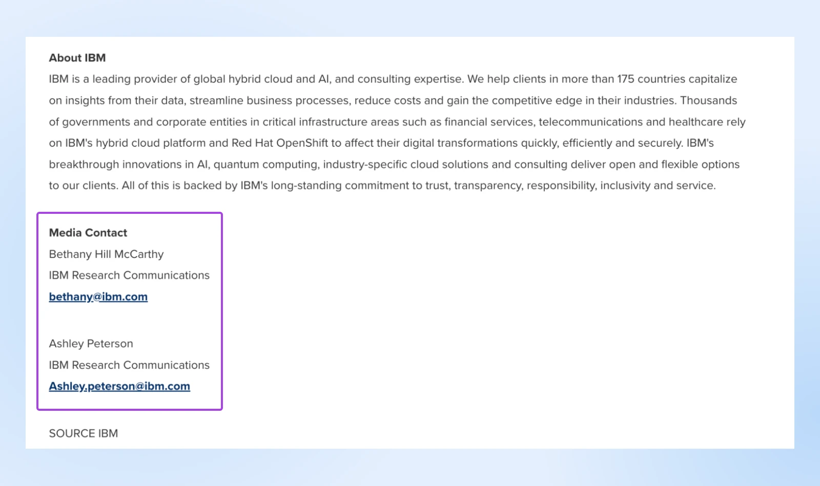 例如,下面是 IBM 新闻稿中的媒体联系部分。