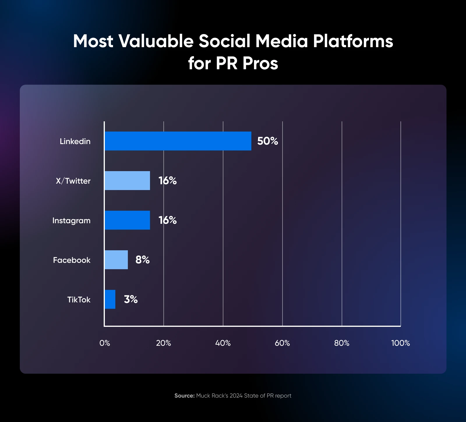 根据 Muck Rack 的《2024 年公关现状》报告,LinkedIn 已成为公关专业人士最重要的社交平台,50% 的人认为这是他们最有价值的网络。