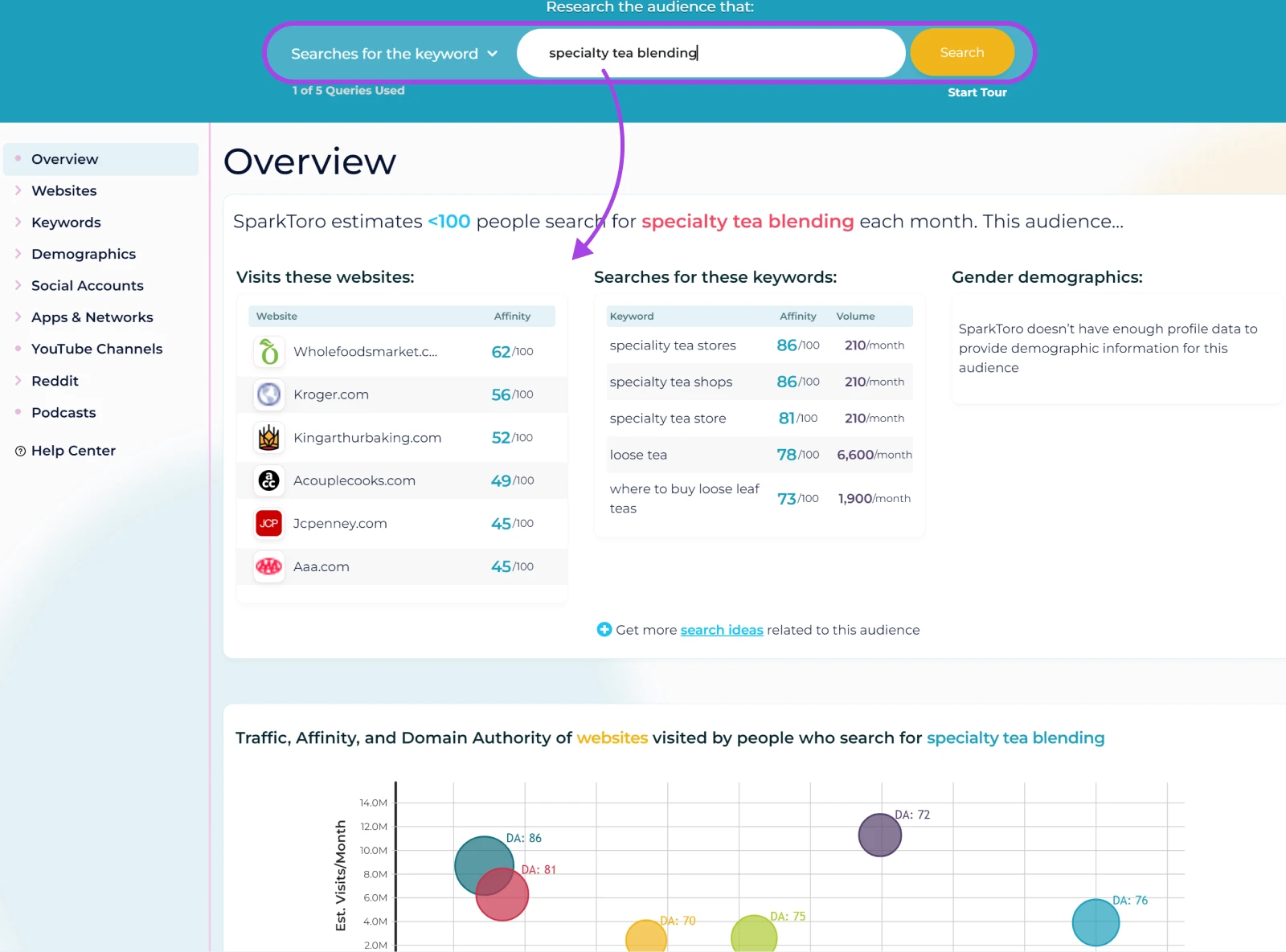 了解受众在哪里上网是成功的一半。SparkToro 是一款简单易用的工具,它可以显示潜在客户会访问的网站、社交账户和播客。