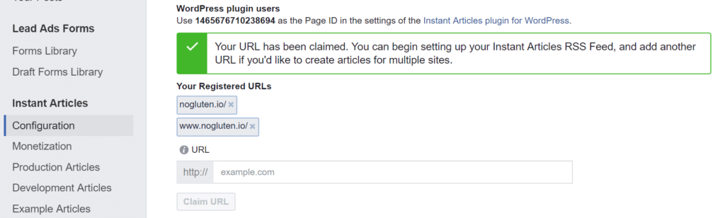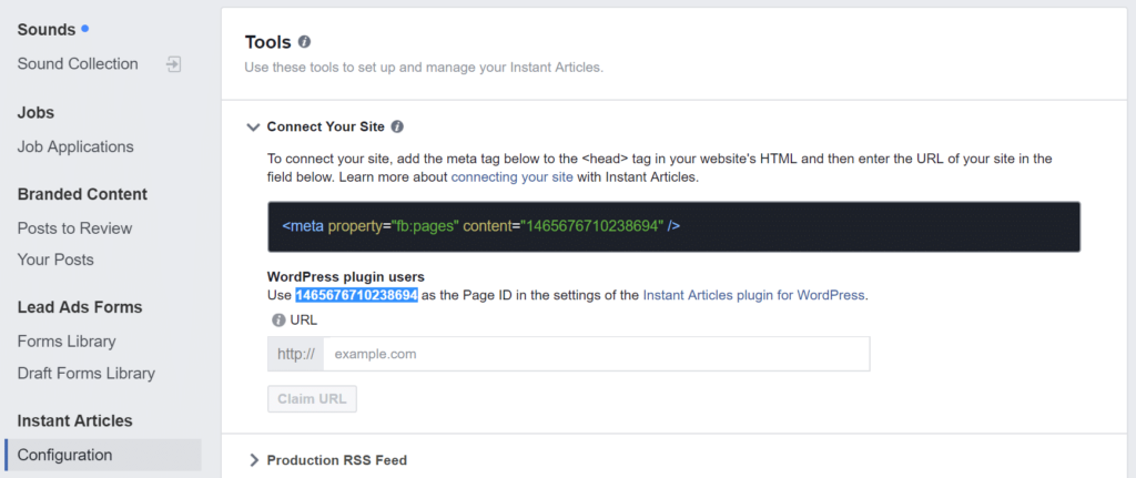 通过申请您的 URL 来证明您对网站的所有权。在 “Instant Articles → Configuration → Tools → Connect Your Site” 下,您可以找到您的页面 ID。将其复制到剪贴板。