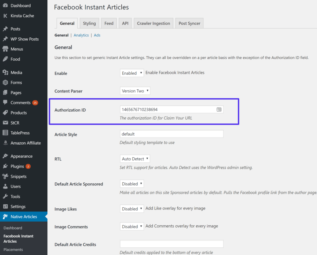 将步骤 2 中复制的页面 ID 粘贴到 WordPress 插件 WP Native Articles 的授权 ID 字段中。