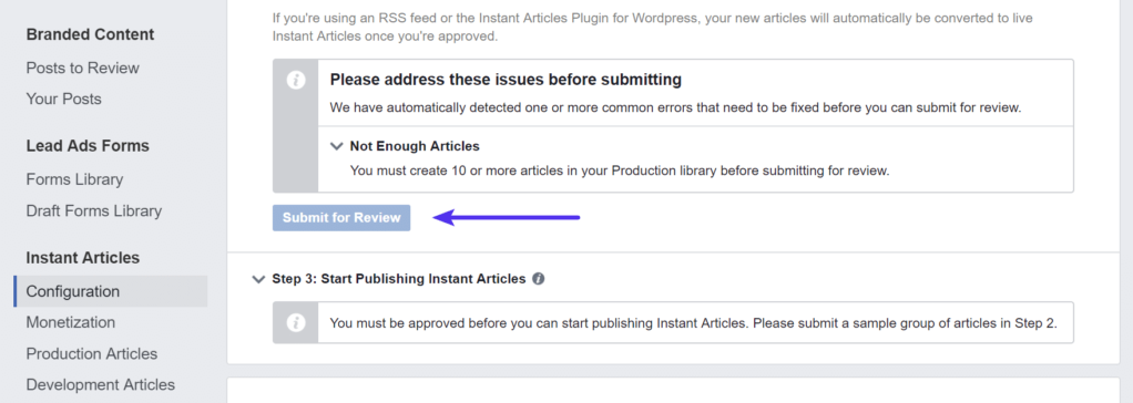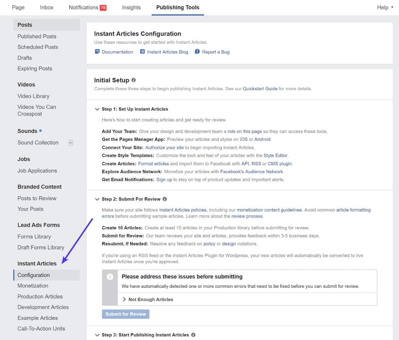 当 Facebook 收录了 10 篇文章后,您就可以从配置页面提交这些文章以供审核。审核通常需要 3-5 天,一旦通过审核,您的 Instant Articles 即可上线。如果有即时文章版本,您分享到 Facebook 页面的任何文章现在都将自动使用即时文章版本。