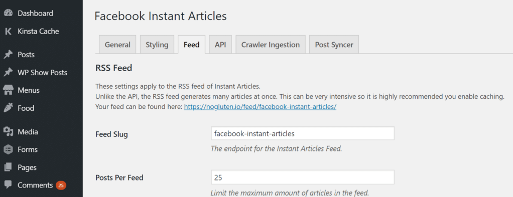 WordPress 插件会自动为您的 WordPress 网站生成 Instant Articles feed。要获取馈送 URL,请在网站 URL 后添加扩展名 /feed/facebook-instant-articles/。您也可以在 WP Native Articles 插件的 “Feed” 选项卡下找到它。