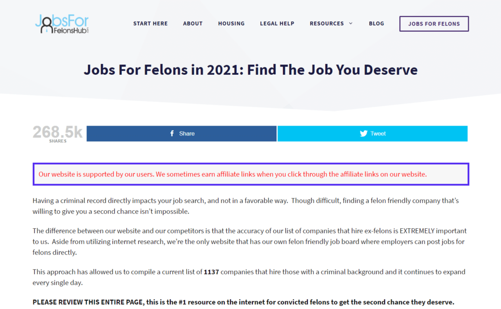 虽然 Jobs For Felons Hub 提供的内容是其业务的驱动力,但他们的联盟链接才是其商业模式的基石 – 他们在网站上也提到了这一点。
