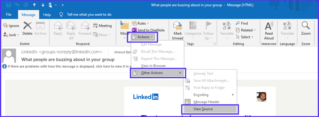 2. 点击窗口顶部菜单中的 “Actions“。接下来,选择 “More Actions“,然后选择 “View Source“。