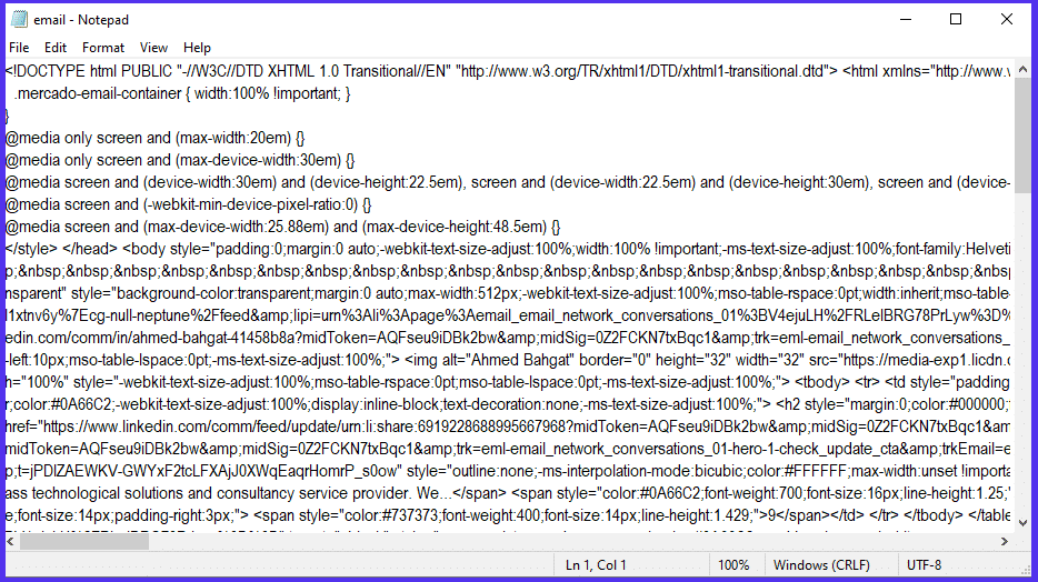 电子邮件标头包括 标记之前的所有代码。以下是电子邮件标头中的详细内容。