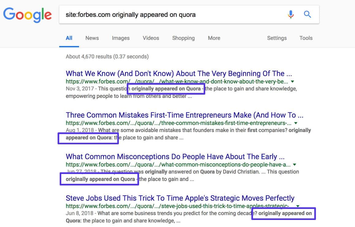 如果你运气好的话,Quora 营销的影响力可以超越独立站网站的用户群。这是因为现在越来越多的网站(包括一些外贸独立站)从 Quora 获取内容。例如,在福布斯网站上搜索,就能看到大量最初出现在该网站上的文章。
