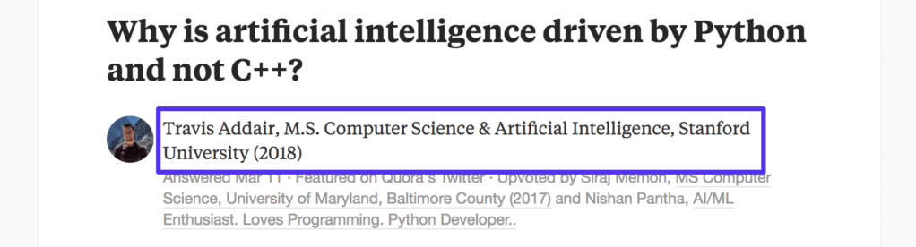 网站上的主题范围很广,从育儿到计算机编程,以及你能想到的任何其他问题–回答这些问题的用户通常在相关主题方面都非常专业。因此,该网站已成为用户希望专家解答问题的首选来源。例如,看看这位回答人工智能问题的用户的资历。