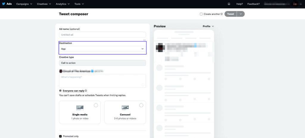 - 测试Twitter广告活动。您可以选择特定的应用程序安装目的地,创建可定制的Twitter卡片