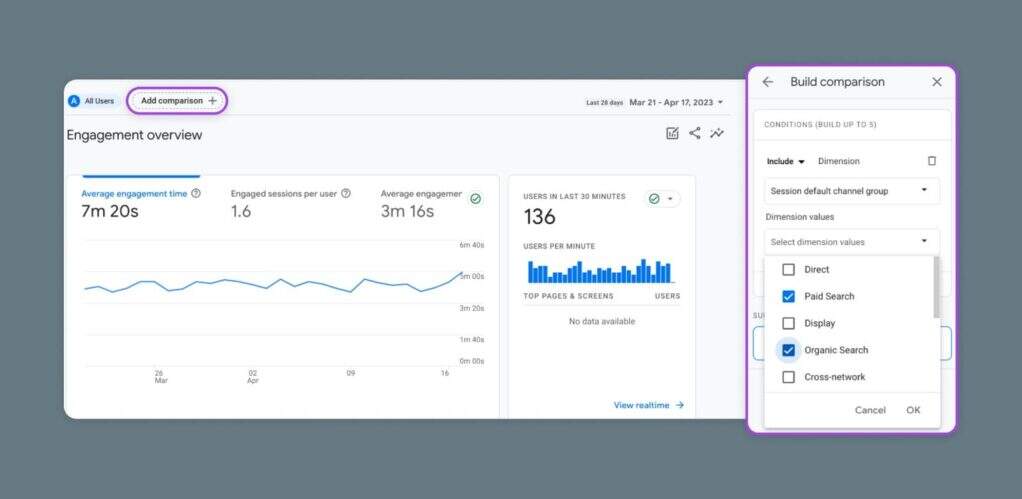 通过比较,你可以看到两个群体如何并排互动。例如,你可以看看自然搜索流量与付费搜索流量的比较。