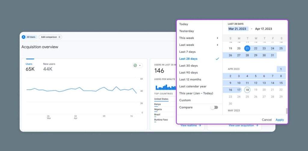 默认情况下,报告将显示过去28天。但你可以在任何时候改变日期范围,只需点击报告右上角显示的日期范围,并设置一个新的范围。