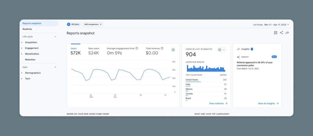 它将所有其他报告中的数据融合到一个单一的视图中,让你大致了解你收到多少流量,你的流量来自哪里,以及用户在你的网站上采取了什么行动。
