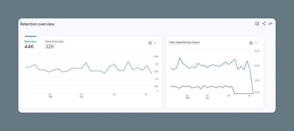 留存报告为你提供了一个简单的快照,说明有多少新用户访问你的网站,以及有多少返回的用户。