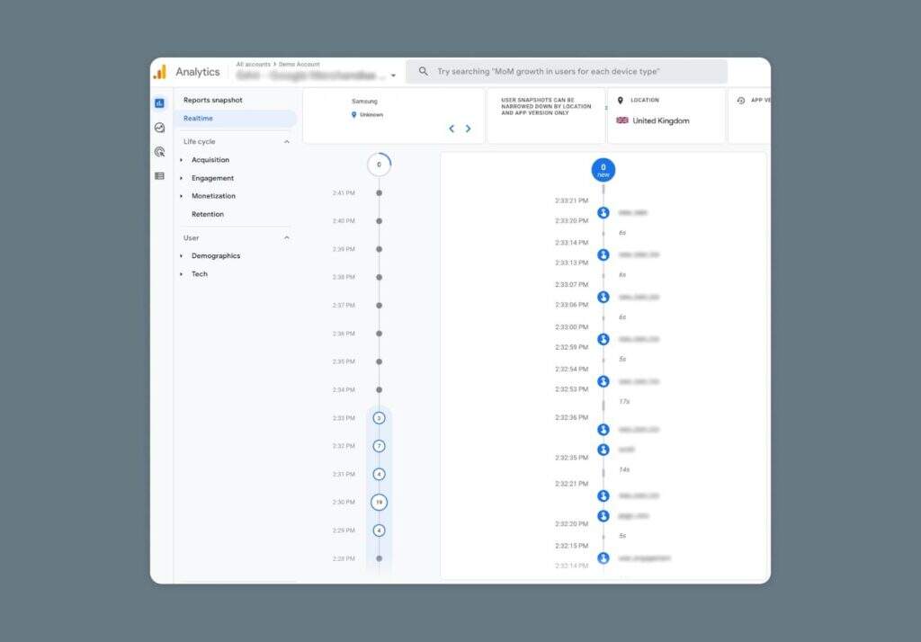 用户快照是使GA4与其他分析工具相比如此与众不同的众多点缀之一。你可以深入了解实际的、真实的用户旅程,准确地告诉你访客的行为和他们想要参与的内容–不受观察偏见的影响,比第三方热图和其他跟踪工具更准确。
