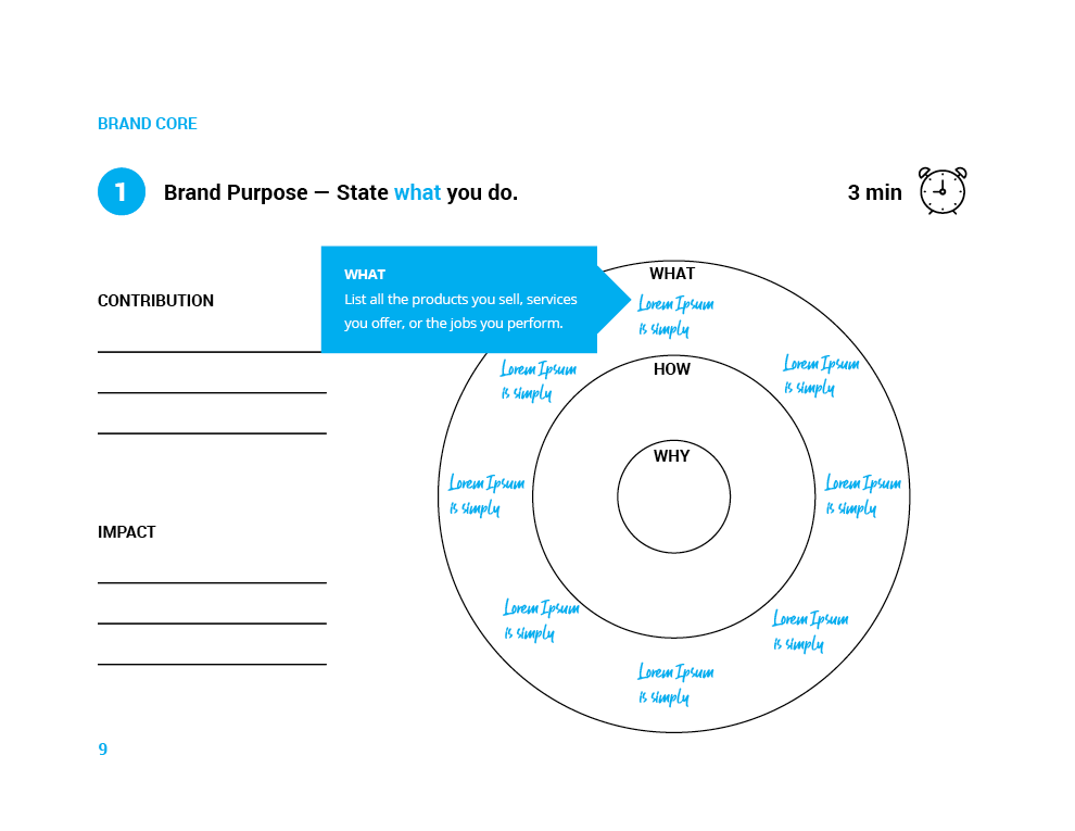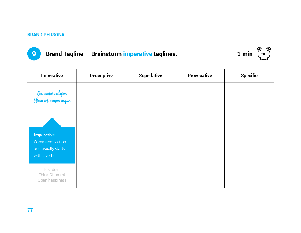 因此,总结起来,我们将在3个不同的部分进行9个品牌塑造练习。