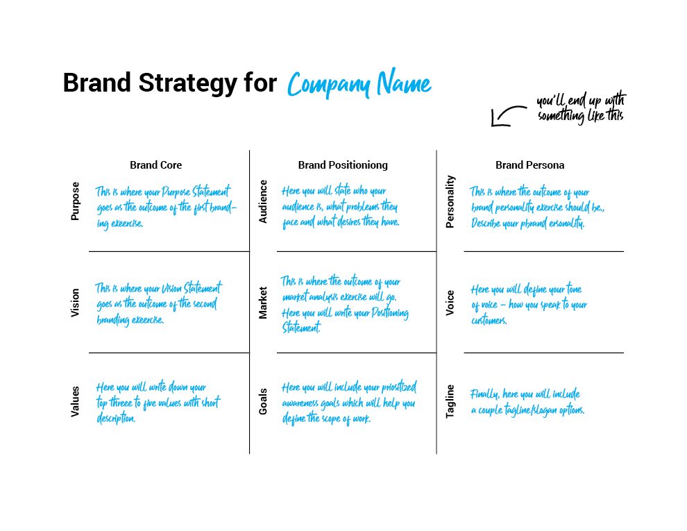 下面你会发现我的品牌战略模板,你可以用它们来制定你自己的流程和工作表。