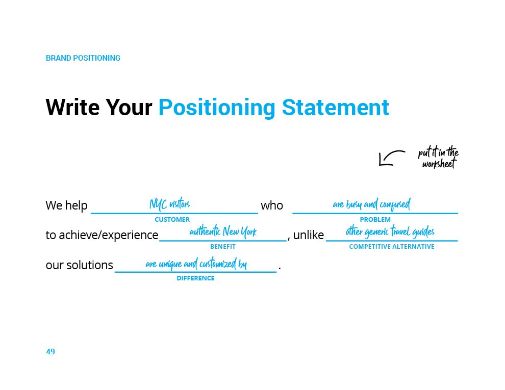 你的定位声明是为了内部目的,而你的标语是为了外部目的–它面向客户,但你的标语当然应该与你的定位保持一致。