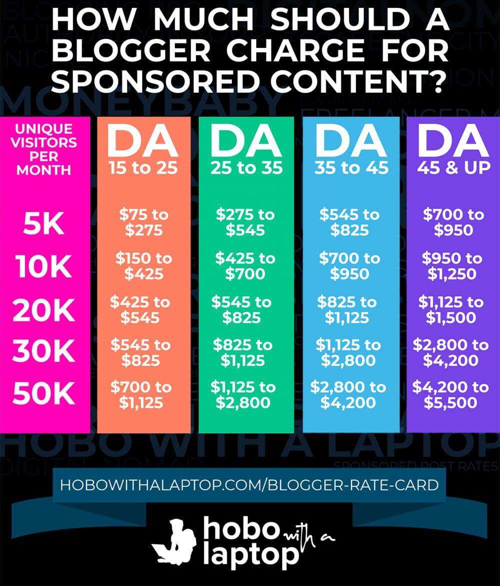 你应该收取多少钱或期望赚多少钱?敲定一个平均价格是很困难的。像域名授权、利基、追随者规模等因素将改变它。但流浪汉背后的写作大脑已经把在接受(或创建)赞助内容感兴趣的博主放在一起一个优秀的 “rate card”。