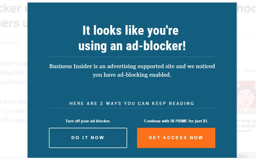 相比之下,访问Business Insider的用户必须在购买、删除广告屏蔽程序或离开之间做出决定。