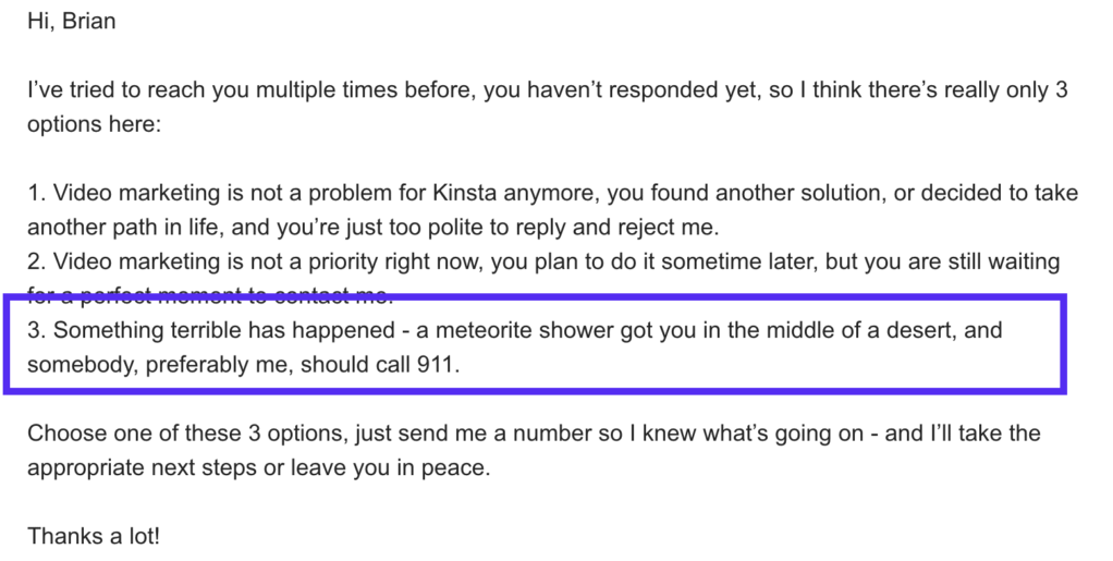 下面是来自Verstiuk团队的一个巧妙的后续电子邮件的例子。正如你所看到的,他们使用了一点幽默感。在此基础上添加图片也会使其更加突出。