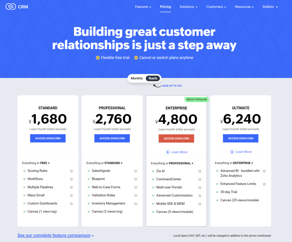 在您注册时,Zoho 会为您提供为期一个月的企业版试用。这真是太棒了,试用版可能会让您在预算中找到用于升级的资金。下图是他们升级页面的简要版本。您还可以在 Zoho 网站上查看每一层的详细分类。