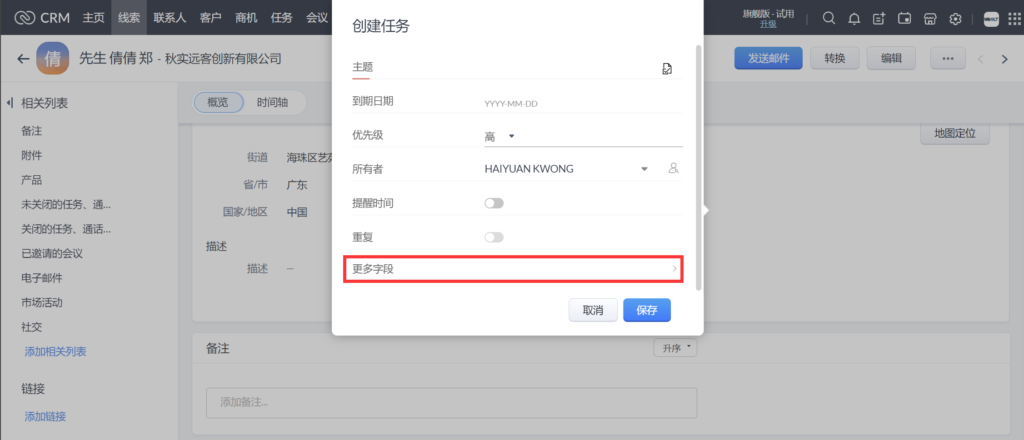 在潜在客户资料本身中,您可以看到所有这些如何相互作用并被列出。您还可以获得在 CRM 的各个选项卡和部分中为自身编制索引的其他选项。