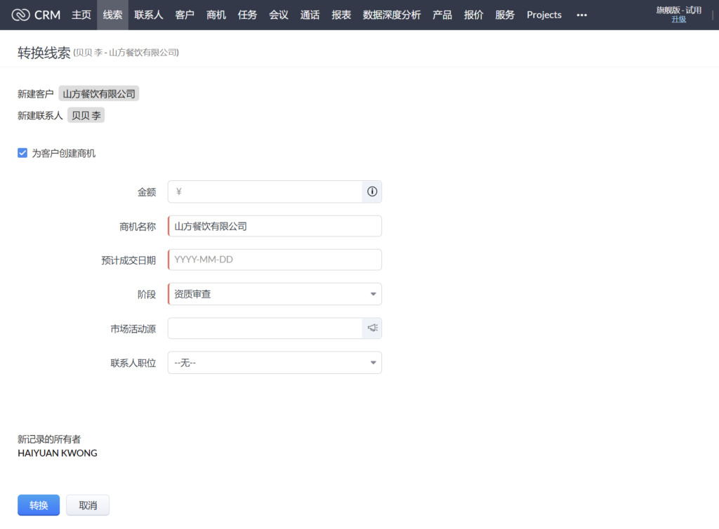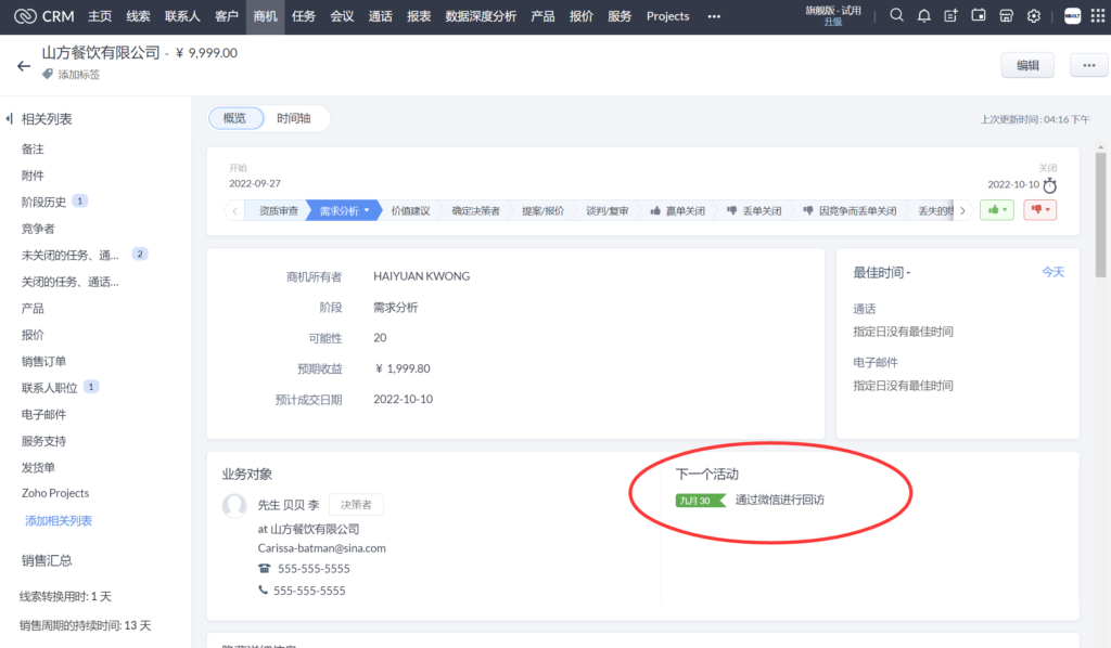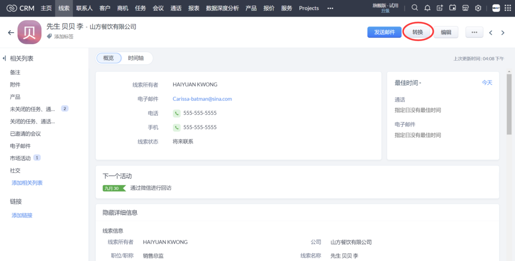 当您与这些人进行交易时,此页面会更新所有与之前的线索、联系人和客户相同的信息。这样一来,您就可以将所有内容完全互连。