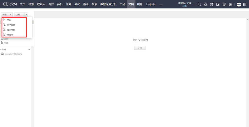 可以从工具栏中的省略号图标(三个点)访问“ 文档”选项卡。它简单明了。您可以上传文档、音乐、图片、视频和整个文件夹以保存在 Zoho CRM 环境中。您还可以点击 创建 按钮并访问 Zoho 版本的文字处理器、电子表格软件和演示文稿制作工具。它们就像 Microsoft Office 365 或 Google Drive 一样工作,而且从我对它们的有限试用来看,它们似乎工作得很好。