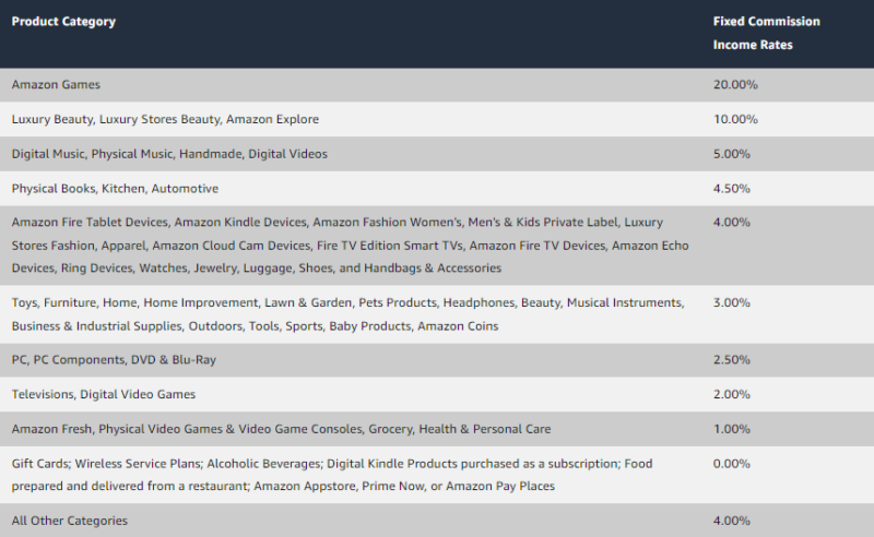 亚马逊的佣金率因产品类别而异。但是,与其他针对初学者的联盟营销计划相比,它们往往相当温和。