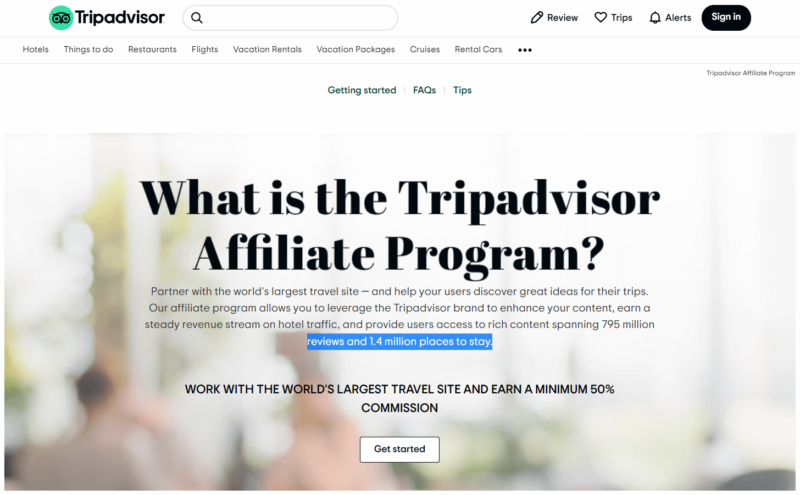 Tripadvisor的返利联盟营销计划可让您与最大的国际旅游网站合作并帮助您的受众计划假期。此外,该计划的灵活设计使您无需购买即可赚取被动收入: