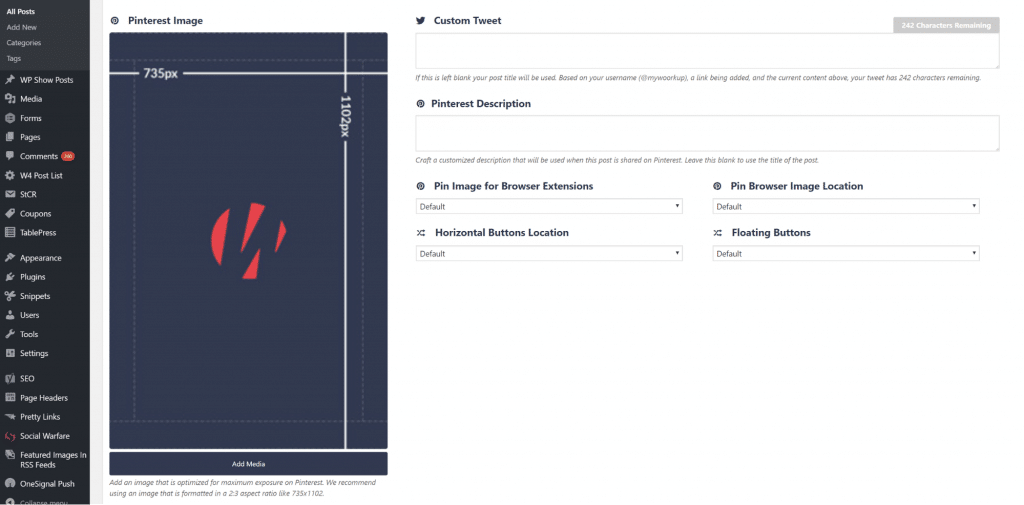 Social Warfare就是这样一款WordPress插件,它可以使用社交分享按钮和Pinterest营销。除了能够使用它来设置自定义Pinterest图像和回退,他们的Pro版本还有一个独特的功能,称为“用于浏览器扩展的Pin图像”。当转到ON位置时,当访问者使用浏览器扩展来Pin时,此切换会将您的自定义Pinterest图像添加到要Pin的图像选择中。Social Warfare Pro的单一网站许可证起价为每年29美元。