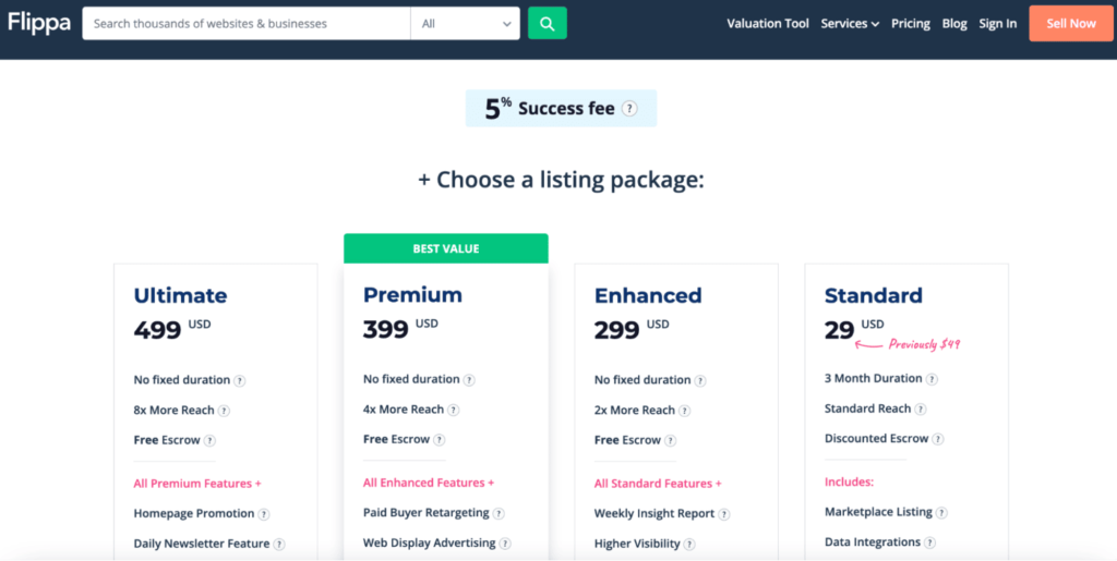 Flippa 是一项可用于销售域名和整个预建网站和企业的服务。根据您的销售规模,这项优质服务会收取大量费用(最高 499 美元)。最重要的是,成功销售需要 5% 的佣金。