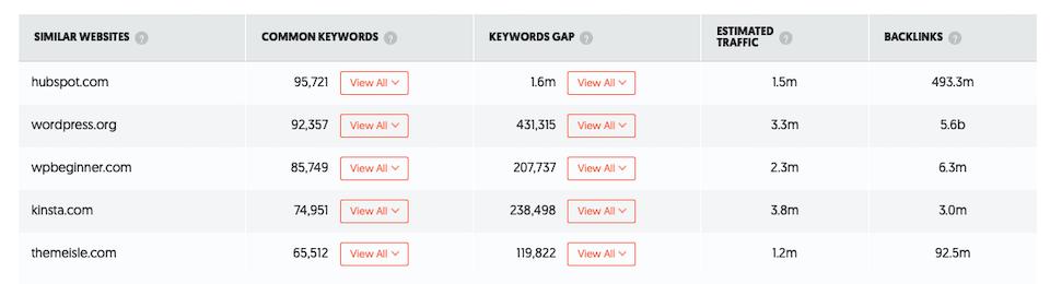 Common Keywords和Keywords Gap报告特别有用。您可以根据您已经拥有的关键字以及需要添加更多的关键字来准确地查看关注点。单击View All展开关键字列表。