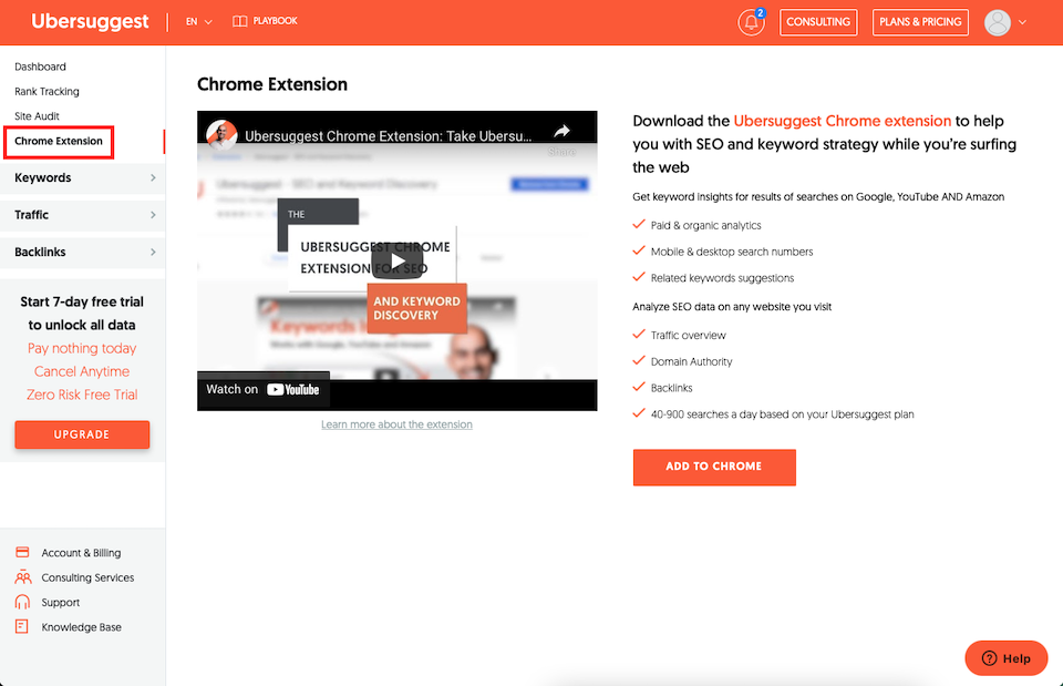 这是Ubersuggest的Chrome扩展程序的促销页面,当您访问不同的网站时,它会提供关键字和其他SEO数据。