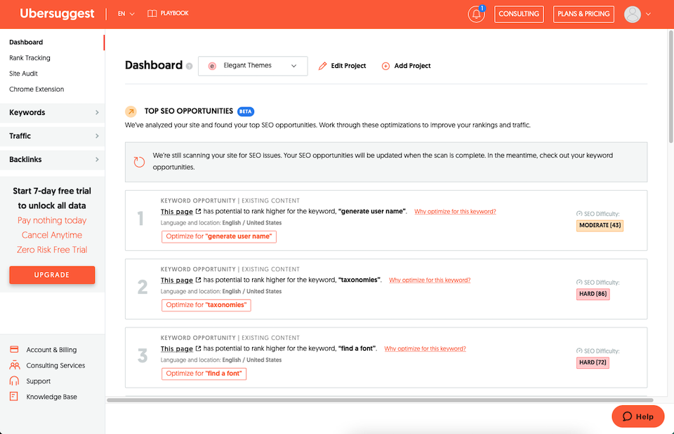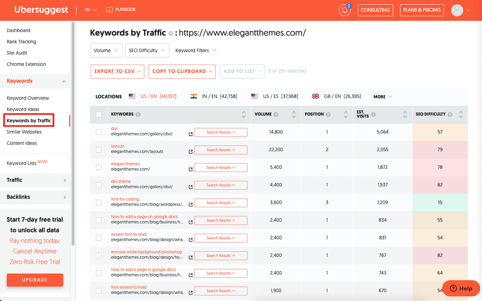 这会从您在设置项目时添加的关键字中提取数据。在您使用Ubersuggest几天后,应该会填充此信息。使用此功能,您可以: