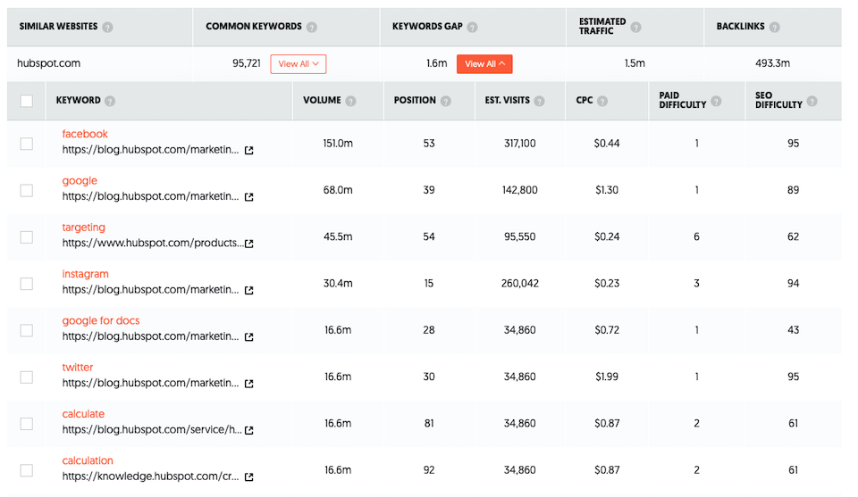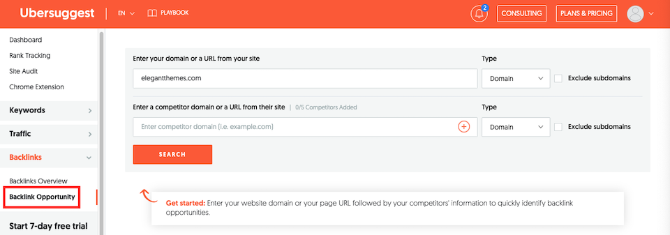 这是另一个仅用于竞争对手研究的Ubersuggest工具。您输入站点的域或URL,以及竞争对手的域或URL,然后单击Search。然后将生成一份报告,其中显示链接到您的竞争对手但未链接到您的网站的域。