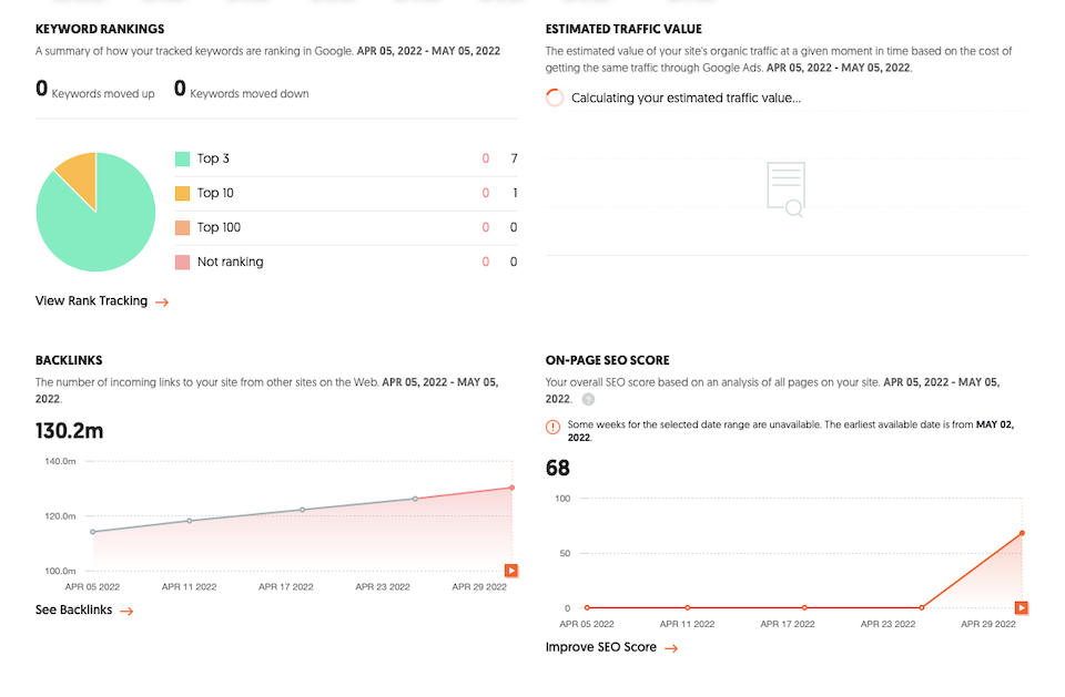 - 在此之下是Keyword Rankings和Estimated Traffic Value并排的两个部分,然后是Backlinks和On-Page SEO Score。