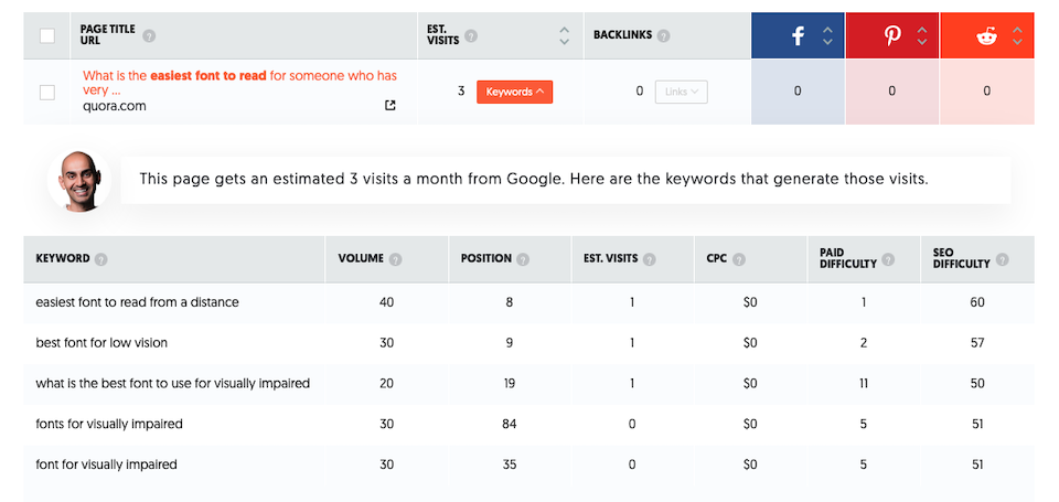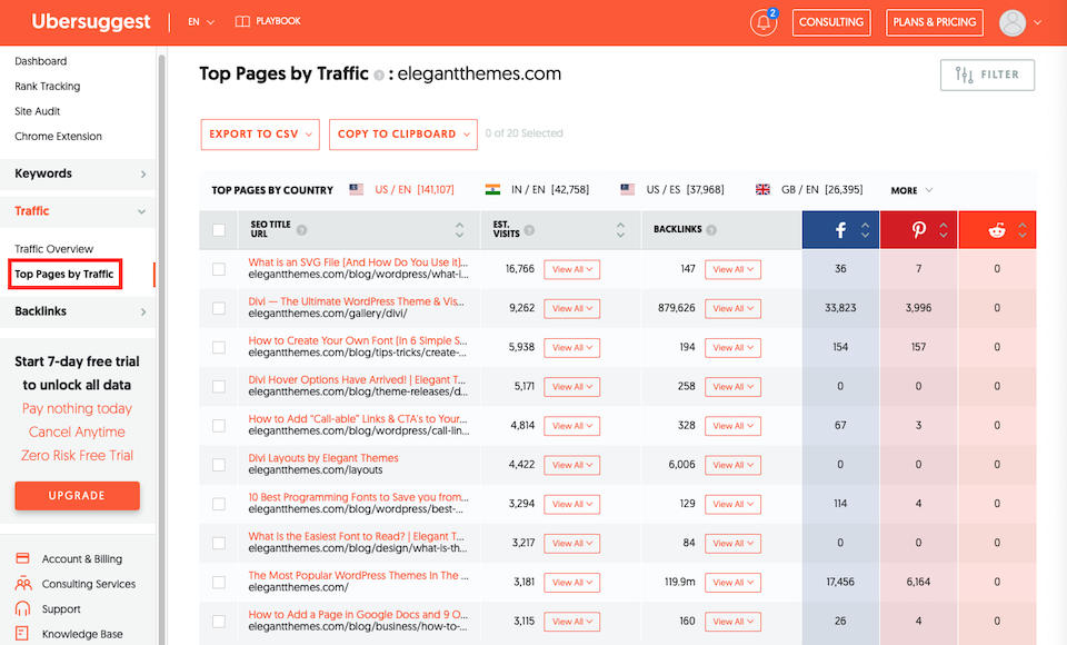 如果人们真正找到并留在页面上,创建内容只有在SEO方面才有意义(如果他们分享您的内容,则可以获得奖励积分)。Ubersuggest的热门SEO页面报告可让您查看竞争对手排名的页面以及正在使用的最流行的自然搜索关键字词组。您还可以查看哪些网站受到了其他领先网站(如主要社交媒体平台)的喜爱。然后,您可以使用该见解来指导您的内容策略。