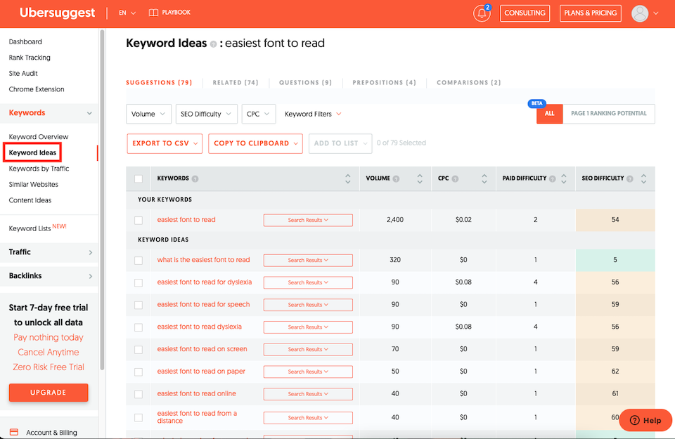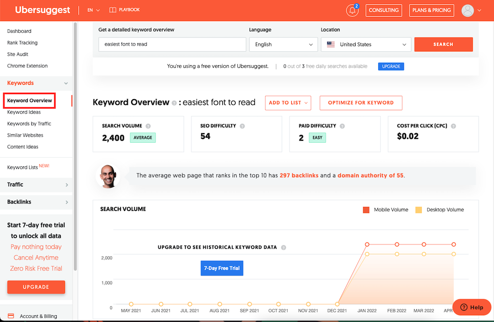需要注意的是,虽然Ubersuggest有一个具有很多功能的免费层,但它并不是一个100%免费的工具。您会注意到,在升级到高级版之前,某些功能会被阻止。不过,同样,免费版本仍然提供了很多其他免费SEO工具所没有的功能。