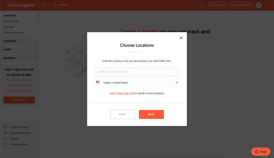 注册后,您将被带回Ubersuggest仪表盘,弹出窗口会提示您创建项目。
