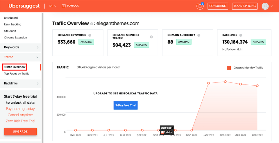 - 接下来是Estimated Organic Traffic,只有在您将Ubersuggest连接到Google Analytics后才会填充。