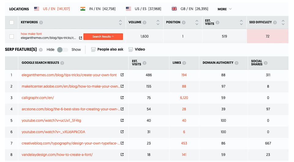 这是竞争对手研究的绝佳功能。您可以找到为域或URL带来流量的关键字。结果可以按Volume、SEO Difficulty或Included/Excluded Keywords排序。通过单击关键字右侧的Search Results,您可以看到更多为该关键字排名的页面,以继续您的竞争对手研究。