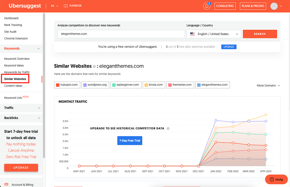 此功能专门用于竞争对手分析。使用Ubersuggest的免费版本,您将看到五个竞争对手的数据。Monthly Traffic图表一目了然地显示了它们之间的关系。在此之下,您可以查看每个网站的统计信息,包括常见关键字、关键字差距、估计流量和反向链接。