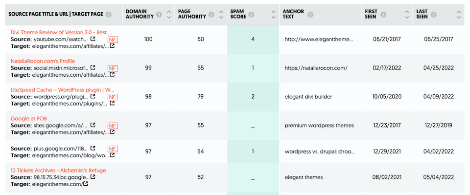最后一部分是一个大的Backlinks图表。图表的第一列列出了反向链接源页面和目标页面URL和标题。然后,您可以查看有关源页面和反向链接的统计信息,包括: