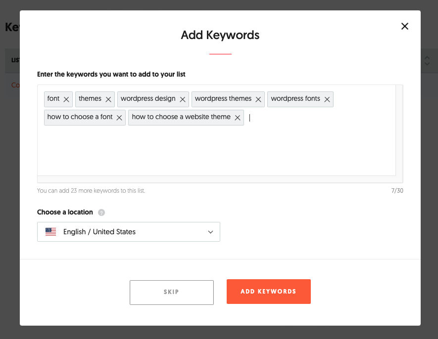 然后,您可以添加关键字并设置语言和位置。完成后,点击Add Keywords。