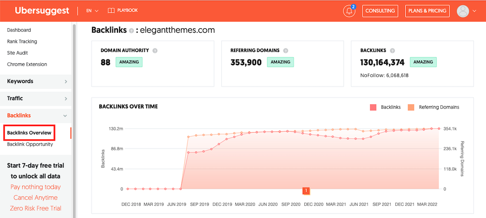 下面是一个Backlinks Over Time变化的图表,显示您网站的反向链接和引用域的数量。