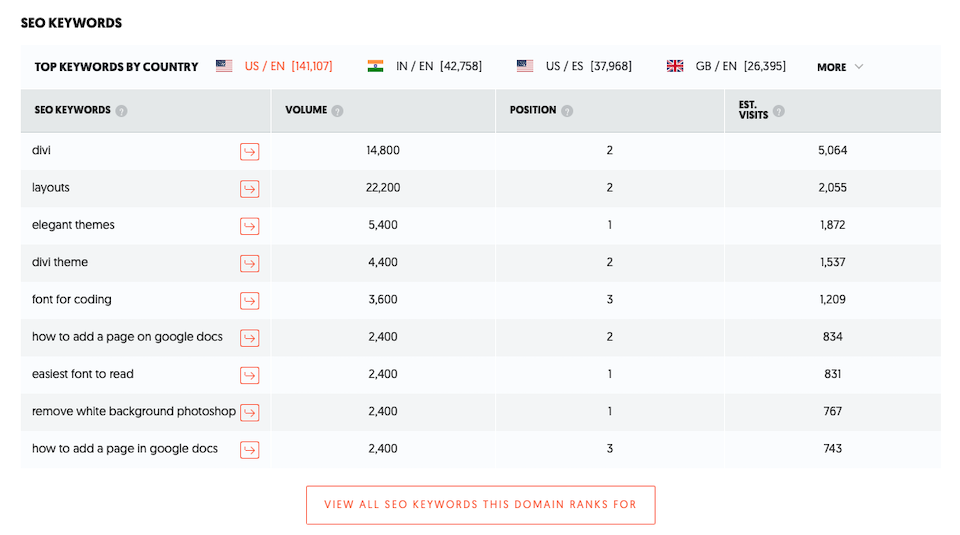 通过单击Est下数字右侧的Keywords。Visits,您会看到产生每月访问的关键字。您可能从未自己想过这些关键字,但您现在可以将它们添加到您的内容中以提升您的 SEO。